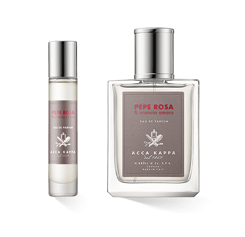 De flacon van Acca Kappa Pepe Rosa & Arancio Amaro laat niet alleen de heldere elegantie van het parfum zien, maar verwijst ook naar de oorsprong van het merk. Het Acca Kappa logo, dat bestaat uit een borstel, kam, fles en tandenborstel, is te zien in het midden van het label. Het logo en de merknaam zijn in het wit gedrukt op een grijze achtergrond, terwijl de naam van de geur het roze van de dominante topnoot oppakt: roze peper. Een geperforeerd reliëfpatroon siert het label en getuigt van de aandacht voor detail die ook in de geur terugkomt. Een slanke, glanzende zilveren dop bekroont de heldere, hoekige glazen kubus.