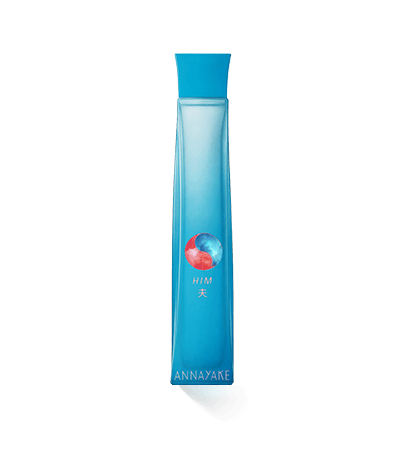 De flacon van Annayake Him is een hoog, asymmetrisch lichaam met een kleurverloop van turquoise blauw aan de basis naar transparant aan de bovenkant. Het glas is gematteerd. De dop is turquoise. Deze kleurencombinatie doet denken aan een brekende golf en symboliseert de frisheid van de geur. In het midden van de voorkant staat een yin-yang teken in turquoise en de contrasterende kleur oranje. Dit symboliseert zowel de warmte van de geur, die wordt gecreëerd door de kruidige en zoete noten, als de balans van de geur. Yin en yang staan voor vrouwelijke en mannelijke energie; elk levend wezen bezit beide energieën in verschillende verhoudingen. De geur bevat ook elementen van typisch mannelijke, maar ook typisch vrouwelijke geuren. De geur kan daarom ook werken voor vrouwen die van frisse geuren houden.