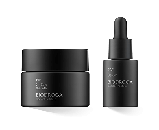 De Biodroga Medical Institute EGF lijn bestaat uit een serum en een 24-uurs moisturiser. Het serum werkt met hooggeconcentreerde actieve ingrediënten om veel symptomen van huidveroudering te verlichten en de teint jonger te laten lijken. Het verbetert de huiddichtheid. De 24-uurs verzorging is ook een allround product met veel positieve effecten voor de rijpere huid. De nadruk ligt hier op langdurige hydratatie en collageenvorming, wat rimpels vermindert en de huid gladder maakt.