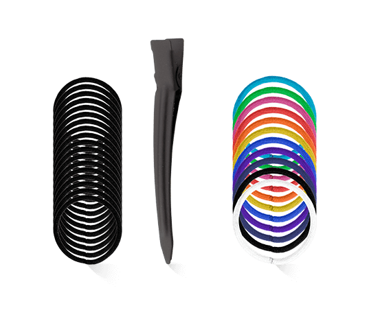De Denman no-damage elastieken, die verkrijgbaar zijn in zwart of felle, heldere kleuren, zijn absoluut onmisbaar voor lang haar. Ze zijn volledig gemaakt van nylon en rubber, wat het haar op zijn plaats houdt maar niet afbreekt zoals haarbanden met metalen clips. De Haarclips Jumbo in zwart en zilver zijn bekend van kapsalons. Door hun licht gebogen vorm en rubberen oppervlak zijn ze erg veelzijdig. Het maakt niet uit of het haar volledig of in afzonderlijke strengen wordt geknipt, gestyled of gekleurd. Dankzij de sterke klemmen die met één hand geopend en gesloten kunnen worden, wordt het haar perfect op zijn plaats gehouden.