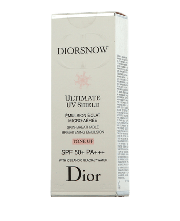 Dior Diorsnow UV Shield Tone Up SPF 50+ van Dior is een getinte zonnebrandcrème voor het gezicht die de huid beschermt tegen schadelijke UV-A- en UV-B-stralen en tegelijkertijd de teint egaliseert. De formule bevat een SPF 50+ PA++ UV-filtercomplex dat beschermt tegen pigmentvlekken, evenals edelweissextract, bekend om zijn verhelderende eigenschappen.