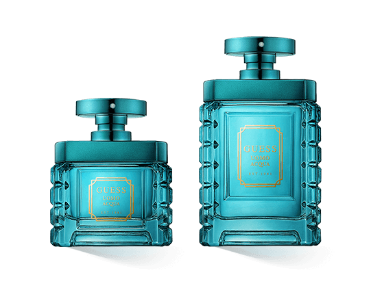 De flacon van Guess Uomo Acqua springt meteen in het oog met zijn cyaanblauwe kleur. De flacon is koel, stralend en helder, met zijn kunstig geslepen glas. De gouden letters in het midden van de voorkant accentueren de fles, die doet denken aan een gevel van een huis. Een glinsterend metalen ornament maakt de fles af, terwijl cilinders van verschillende grootte de sproeikop vormen, die geïntegreerd is in een plat element dat doet denken aan een wiel. Het ontwerp symboliseert de koele, verfrissende noten van de eau de toilette en het geraffineerde karakter van de geur.