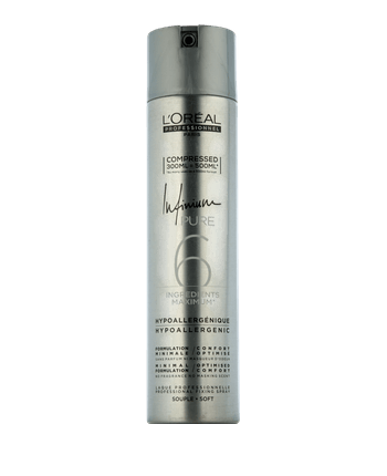 De Infinium Pure Soft Compressed Hairspray van L'Oréal Professionnel geeft je styling een natuurlijke, losse finish met flexibele fixatie. Dankzij de ultrafijne verstuiving ligt het vederlicht op het haar zonder het te verzwaren en zorgt het voor volume en wendbaarheid. De hypoallergene formule zonder parfum en geurstoffen bevat slechts zes ingrediënten en biedt optimaal gebruiksgemak. Dankzij de innovatieve Compressed Technology is de haarlak tot 60 procent effectiever dan de vorige versie van 500 ml, waardoor hij ideaal is voor professionele styling en opsteekkapsels.