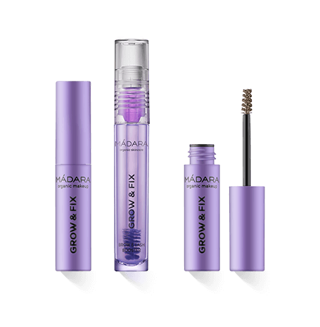 Het haargroeiserum MÁDARA Grow & Fix corrigeert onregelmatige haargroei op wenkbrauwen en wimpers, of dit nu wordt veroorzaakt door hormonen, stress of ziekte. Tegelijkertijd verankert de organische formule de haarwortels waar ze horen: in de haarpapillen tussen de huid en het onderhuidse weefsel. Van daaruit ontspruiten de haartjes aan de opperhuid om hun belangrijke beschermende functie te vervullen.