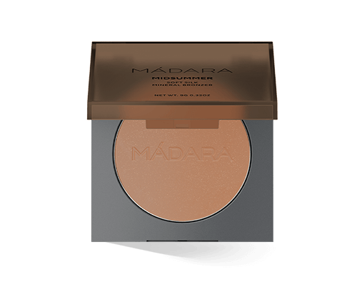 De MÁDARA Midsummer Soft Silk Bronzer: een zonnige gloed en een zuivere, gemakkelijk te mengen formule.