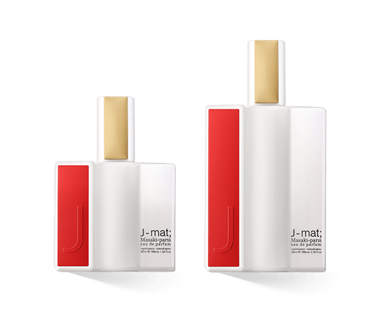 De reclamefoto voor het eau de parfum Masakï Matsushïma J-mat; toont de gezichten van twee vrouwen in close-up. Een breed wit kader schuift de foto naar linksboven, terwijl twee flesjes Masakï Matsushïma J-mat; in de foto uitsteken. Aan de rechterkant van het witte kader staat de inscriptie "J-mat; masakï paris" in zwarte letters.