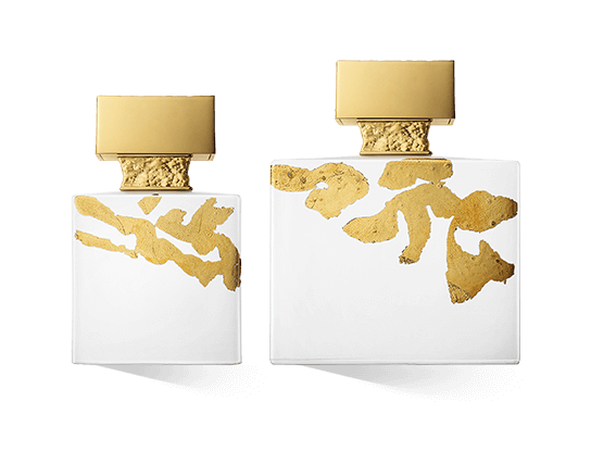 De flacons van Eau de Parfum en Nectar Parfum lijken op elkaar. Ze hebben alleen een iets andere vorm. Beide vertegenwoordigen het romige karakter van het parfum met een witte body. De bovenste, schuine helft van de flacon is bedekt met bladgoud. Het ontwerp doet denken aan bladeren in de wind of eilanden op een kaart. De hals van de flacon heeft de karakteristieke structuur van Franse niche flacons. De dop heeft ook de typische all-round structuur met gladde voorvlakken. Beide elementen glinsteren in een warme gouden kleur die het karakter van de stralende geur prachtig weergeeft.
