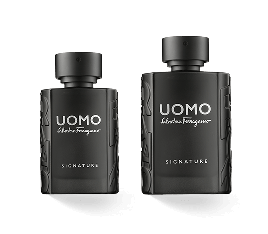 De printcampagne voor de presentatie van Salvatore Ferragamo Uomo Signature beperkt zich tot de onopgesmukte presentatie van de flacon en de omverpakking. De zwarte verpakkingsdoos met de zilveren letters en de als bij toeval gevangen letters van de merknaam is een indrukwekkend reclamemedium.