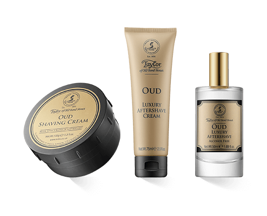Tijdloze stijl ontmoet oosterse diepgang: de Taylor of Old Bond Street Oud lijn combineert Britse scheertraditie met de luxe geur van Oud.