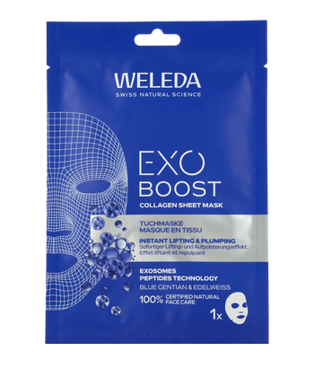 Het Weleda Exo Boost Collageen Sheet Mask with Blue Gentian combineert het Collageen+ Actief Complex met de innovatieve Exosome Peptide Technologie. Het masker hydrateert onmiddellijk, maakt de huid zichtbaar voller en geeft haar een stralende gloed. Al na het eerste gebruik ziet de huid er gladder en steviger uit en zijn kraaienpootjes geminimaliseerd. De 24-uurs moisturizer ondersteunt een verfijnde, jeugdig uitziende teint en zorgt voor nieuwe frisheid en elasticiteit.
