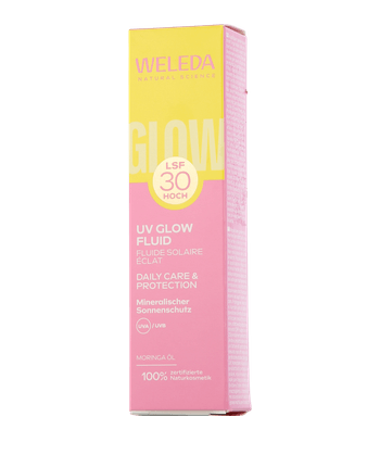 De Weleda Speciaalverzorging Glowy UV-Fluid SPF 30 combineert dagelijkse bescherming tegen de zon met een natuurlijke uitstraling. De lichtgewicht formule met honderd procent minerale filters biedt onmiddellijke UV-A/UV-B-bescherming en is ideaal voor de gevoelige huid. Dankzij de toevoeging van voedende moringa-olie en lichtreflecterende glanspigmenten hydrateert de sun fluid 24 uur lang en zorgt voor een frisse, egale teint zonder een wit laagje. Het is vrij van octocrylene, octinoxate, oxybenzone en geurstoffen en zorgt voor een beschermde, stralende huid.