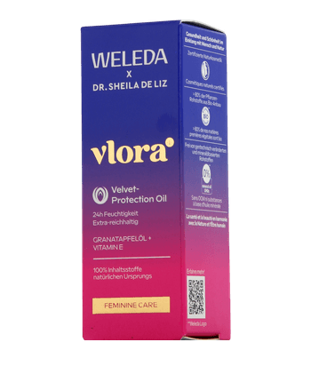 De Weleda Vlora+ Velvet-Protection Oil biedt intensieve verzorging en 24 uur hydratatie voor de uitwendige intieme zone. De rijke, microbiome-vriendelijke formule met granaatappelpitolie, ricinusolie en vitamine E regenereert de gestreste huid en verlicht het trekkerige gevoel dat wordt veroorzaakt door droogte. De olie wordt gemakkelijk geabsorbeerd en laat de huid fluweelzacht en beschermd aanvoelen. De gynaecologisch geteste olie is ontwikkeld in samenwerking met Dr. Sheila de Liz en is ook geschikt voor gebruik tijdens zwangerschap en borstvoeding. Voor langdurig welzijn.